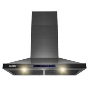 The 30-inch Island Mount Range Hood is a perfect blend of European modern contemporary design and high-quality craftsmanship. Featuring curved tempered glass and black painted stainless steel, this range hood serves as a striking centerpiece in any kitchen. With a powerful 343 CFM airflow, it efficiently clears your cooking area of smoke, grease, and odors while maintaining a relatively quiet environment.The range hood is equipped with four built-in 1.5-watt LED lights that provide bright and consistent illumination across your cooktop, ensuring clear visibility whether you’re cooking during the day or night. For easy maintenance, it includes removable, dishwasher-safe baffle filters that effectively collect grease and oils. Designed with advanced, sleek touch-friendly controls, you can effortlessly operate both the fans and lights. Choose from three (3) fan speeds to achieve the ideal level of suction for your cooking needs. The top vertical exhaust seamlessly connects to your existing ductwork with the included duct pipe, ensuring efficient ventilation. For those who prefer ductless installation, a carbon filter kit (CF0011) is included to maintain clean air circulation. The range hood also features a decorative chimney compatible with ceiling heights of 8 to 8.5 feet, adding a sophisticated touch to your kitchen’s aesthetics. AKDY offers a 3-year limited parts warranty, providing peace of mind and ensuring your investment is well protected.