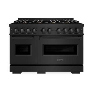 Luxury isn’t meant to be desired – it’s meant to be attainable. The ZLINE 48 in. 6.7 cu. ft. Classic Double Oven Gas Range in Black Stainless Steel with 8 Brass Burners (CGRB-BR-48) combines the elegance of a hand-finished porcelain gas cooktop with 8 Italian-made brass auto-reignition burners, a large gas convection oven with an energy-efficient cooling fan to ensure quiet operation, a small baking oven, and Landscape oven door window designs allowing you to master every meal. With a modern, timeless style and refined functionality, ZLINE Classic Gas Ranges are masterfully crafted to deliver an elevated culinary experience.