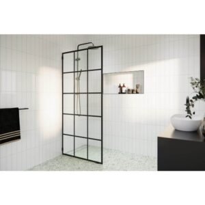 Make a striking statement in your bathroom with the eye-catching design of the Esprit fixed shower panel. High-quality glass enhances the light in your space, while the industrial aesthetic introduces a contemporary feel. Taller than most competitor shower enclosures, our 3/8″ tempered glass panels come in a standard 78″ height. Glass is treated with EnduroShield coating, which aids in repelling water and soap residue. In addition, our superior quality solid brass hardware is available in a variety of color finishes to suit any bathroom. With an extensive range of fixed shower panel sizes available, the Esprit by Glass Warehouse has a sleek, ceramic, matte black finish baked onto the glass making it a long-lasting, easy to clean design.