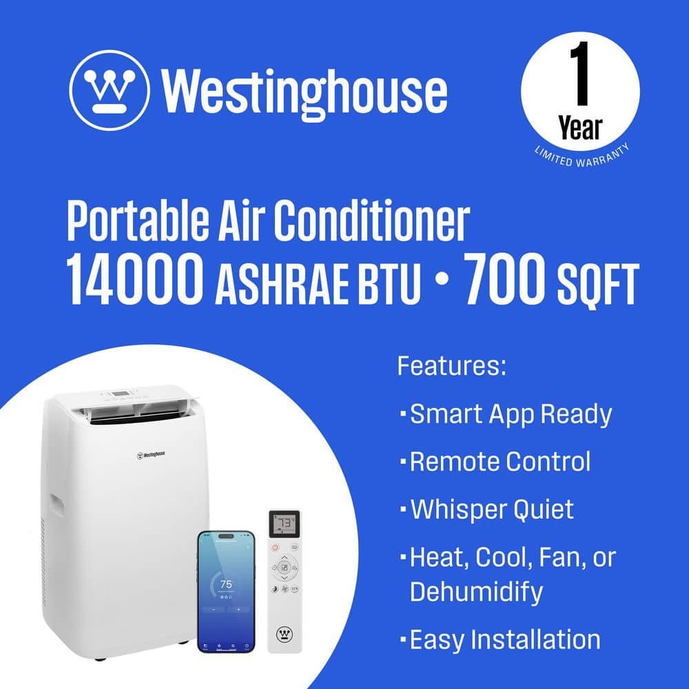 Enjoy complete comfort with this Westinghouse WPac14000s portable Room Air Conditioner that powerfully and quietly cools rooms up to 700 square feet. The multi-functional unit also has dehumidifying and fan settings to deliver greater versatility. Manage the temperature up or down and easily change settings with the user-friendly control panel, remote, or smartphone app. Use everything you need for quick and easy installation is included with the air conditioner. Find your ideal climate and enjoy quiet, cool relaxation all year long.