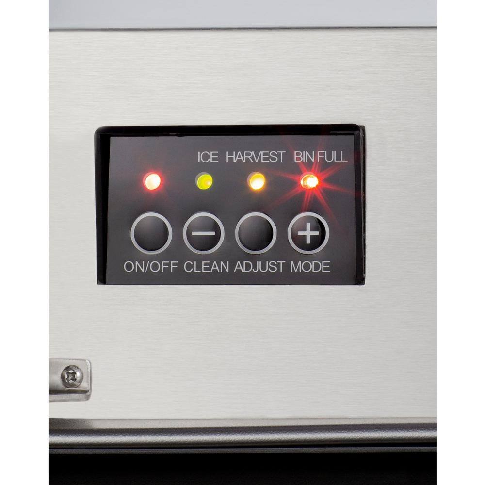SUMMIT BIM47OSE is a commercial grade outdoor icemaker designed for true convenience in operation and placement. Automatic defrost makes maintenance simple and stress-free, while the BIM47OSE’s front-breathing cooling system and fully finished sides allow built-in or freestanding use. A 15 in. W makes it ideal for any tight location, with an internal built-in pump for more flexibility in placing the unit. This model is ENERGY STAR qualified as a commercial batch-type icemaker. The BIM47OS can make up to 50 lbs. of clear cube-shaped ice, with an adjustable bin capacity that temporarily hold up to 25 lbs. The ice is produced in sheets and can easily be broken into cubes with the provided stainless steel scoop, which can be mounted on brackets inside for easy use. An interior light in a blue hue allows for easy viewing of the interior. This unit must be used with a drain. This unit features a complete stainless steel exterior for lasting use in the outdoors. The user-reversible door swing (LHD is default door swing) includes a curved towel bar handle. This unit is NSF listed for use in commercial establishments.