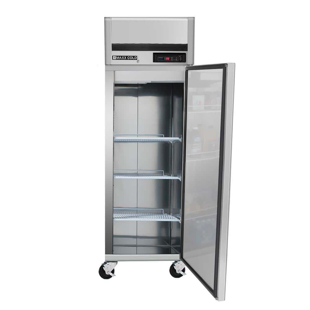 Keep food fresh in a commercial kitchen with this Maxx Cold 27 in. W single door, top-mount, reach-in freezer. With up to 23 cu. ft. and three heavy-duty, fully adjustable and easy-to-clean PE coated wire shelves, you have space for full-sized sheet pans and more. An easy-to-grip, field reversible recessed handle with a lock and key set and a self-closing door make it suitable for a limited space. Made to help you in meeting all food service industry requirements, it offers integrated energy-saving interior LED lighting, automatic defrost function, an integrated condensate evaporator (meaning no drain line connection is needed) and digital temperature control which maintains optimum temperature. The 4-in. Dia swivel caster wheels allow easy moving. For convenience, this Energy Star-rated unit comes with an open-door alert that beeps if it is left open for five minutes. The stainless-steel interior and exterior add durability.