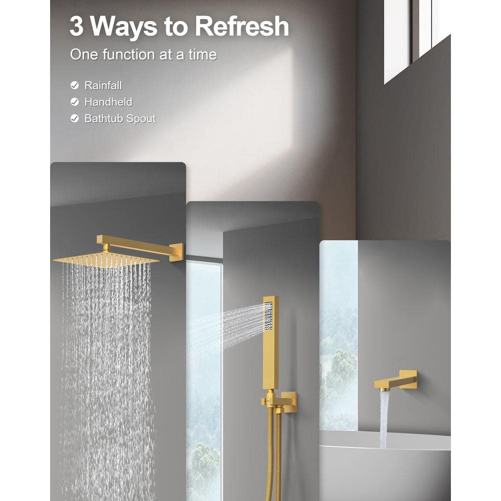 3-Spray Square High Pressure Wall Bar Shower Kit Tub and Shower Faucet with Hand Shower in Brushed Gold (Valve Included)