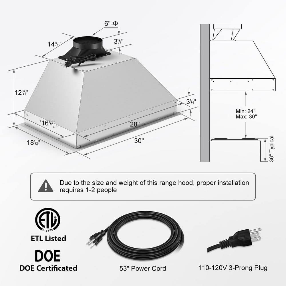 Tylza 30″ insert range hood has a variety of functions. We offer three solutions for the control of it. They are gesture control, touch control, and remote control. The insert range hood is also equipped with three 3W LED lights in warm color. With a ventilation capacity of up to 900CFM, there are four adjustable wind speeds. Considering the actual cooking situation, we design the control panel tilted at an angle, so that we can easily view the real-time information of the range hood. The insert range hood can be used not only in ducted mode, but also in ductless mode. The hood itself is equipped with an activated charcoal filter. It’s connected to the power supply using the 110-120V 3-Prong Plug with the 53″ long power cord