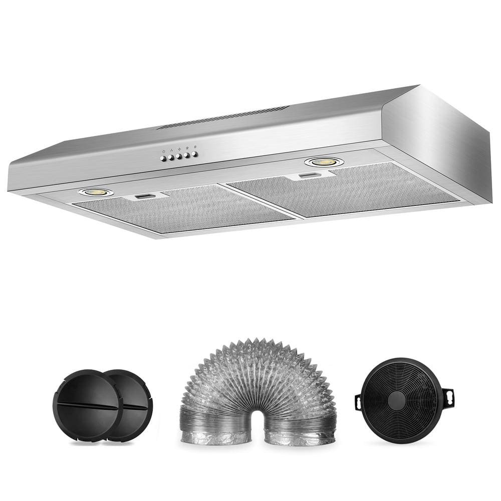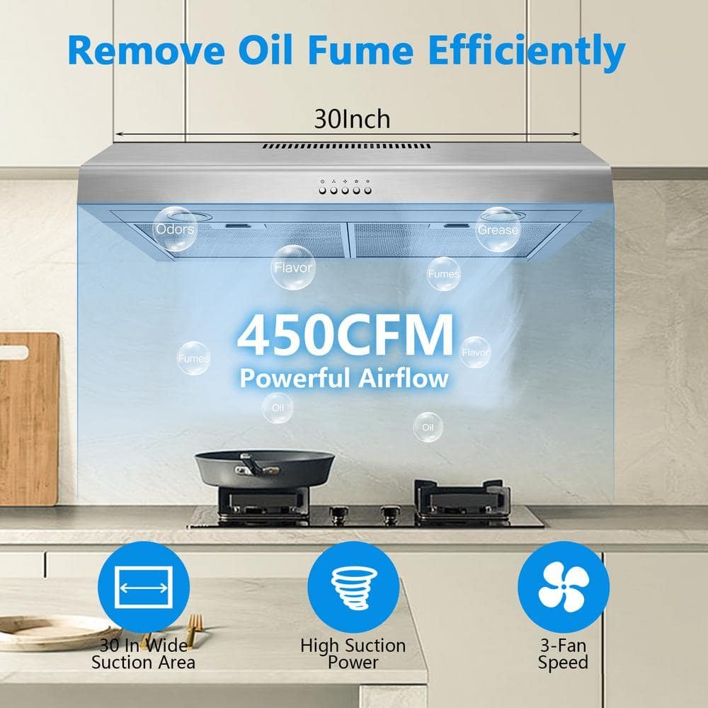 Introducing a 30 in. under-cabinet range hood that combines a sleek and substantial design, perfect for enhancing any kitchen aesthetic.Crafted from durable stainless steel this kitchen vent hood boasts rust, temperature and corrosion-resistant properties, ensuring longevity for years to come.Equipped with a powerful 450 CFM airflow this hood efficiently and swiftly eliminates large amounts of grease, heat, smoke and lingering cooking odors from your home. The 3-speed easy push button controls allow you to customize the airflow to match your cooking needs, while maintaining an extremely quiet operation with a maximum noise level of only 60dB.The 5-layer reusable aluminum filter captures grease effectively, simplifying cleanup. Bright and energy-saving the hood features 2 x 3W white LED lights that provide ample illumination to your cooking area. Upgrade your kitchen with this reliable and stylish range hood.