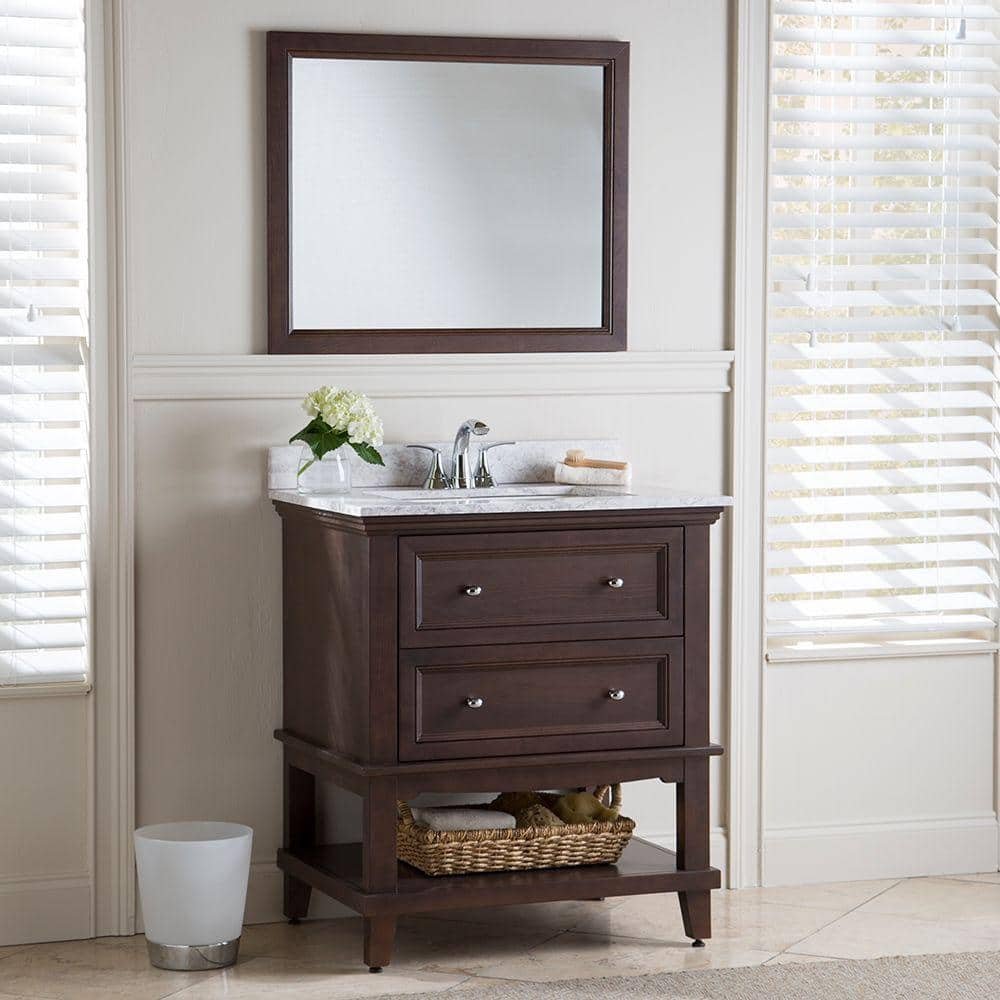 Complete your bathroom vanity with the Home Decorators Collection 31 in. W x 22 in. D cultured marble vanity top in winter mist. The Stone Effects winter mist finish gives the look of natural stone with heavy maroon veining and warm brown and beige flecks on an off-white background. And its Diamond Shield Surface Coating, a marine-grade gel coating, provides a smooth, easy-to-clean surface with enhanced wear- and stain-resistance, giving you the look of natural stone without the extra maintenance.Made to fit a standard 30 in. W x 21 in. D floating or freestanding bathroom vanity cabinet, this 0.75 in. thick vanity top includes a rectangular sink that is designed without an overflow hole to help prevent bacterial growth. This durable sink top is predrilled to allow you to choose the 4 in. centerset faucet that coordinates with your bathroom decor. An unattached 3.5 in. H backsplash in winter mist completes this vanity top set.This single-sink vanity top is designed for quick installation and can be attached to your bathroom vanity with silicone caulking (sold separately).