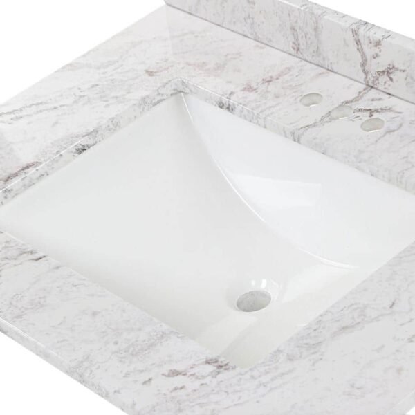 Complete your bathroom vanity with the Home Decorators Collection 31 in. W x 22 in. D cultured marble vanity top in lunar. This Stone Effects lunar finish features dark gray and maroon veining and speckling on an off-white base for a natural stone look. And its Diamond Shield Surface Coating, a marine-grade gel coating, provides a smooth, easy-to-clean surface with enhanced wear- and stain-resistance, giving you the look of natural stone without the extra maintenance.Made to fit a standard 30 in. W x 21 in. D floating or freestanding bathroom vanity cabinet, this 0.75 in. thick vanity top includes a pre-attached undermount rectangular sink that’s designed without an overflow hole to help prevent bacterial growth. This durable sink top is predrilled to allow you to choose the 4 in. centerset faucet that coordinates with your bathroom decor. An unattached 3.5 in. H backsplash in lunar completes this vanity top set.This single-sink vanity top is designed for quick installation and can be attached to your bathroom vanity with silicone caulking (sold separately).