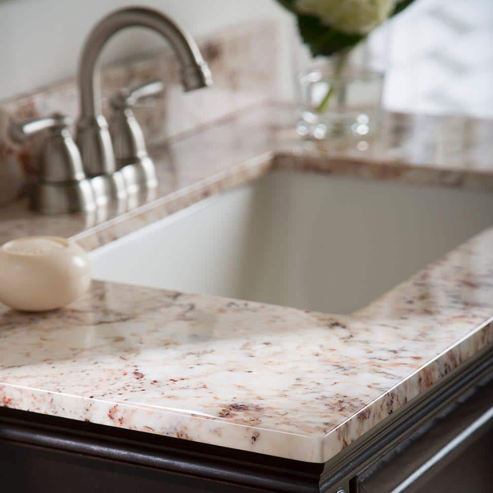 Complete your bathroom vanity with the Home Decorators Collection 37 in. W x 22 in. D cultured marble vanity top in rustic gold. This Stone Effects rustic gold finish creates the appearance of natural stone with various shades of golden orange and dark gray veining and speckling on an off-white background. And its Diamond Shield Surface Coating, a marine-grade gel coating, provides a smooth, easy-to-clean surface with enhanced wear- and stain-resistance, giving you the look of natural stone without the extra maintenance.Made to fit a standard 36 in. W x 21 in. D floating or freestanding bathroom vanity cabinet, this 0.75 in. thick vanity top includes a pre-attached rectangular sink that’s designed without an overflow hole to help prevent bacterial growth. This sink top is predrilled to allow you to choose the 4 in. centerset faucet that coordinates with your bathroom decor. An unattached 3.5 in. H backsplash in rustic gold completes this vanity top set.This single-sink vanity top is designed for quick installation and can be attached to your bathroom vanity with silicone caulking (sold separately).