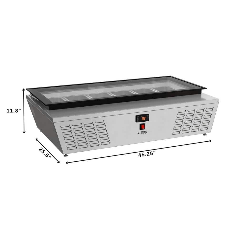 Koolmore 45 in. Countertop Ice Cream Display Freezer with Glass Top and 6 PansThe 45 in. Countertop Ice Cream Freezer is a stylish and functional solution for ice cream shops, cafes, and food service venues.With a static cooling system that preserves frozen goods at an ideal temperature range of 7.6В°F to 10.4В°F, this freezer ensures the best quality for your ice cream and desserts.Its stainless-steel body and double-tempered glass construction promise durability and safety, while the glass display cover provides clear visibility of products while protecting them from contaminants. The soft-closing cover adds convenience and extends the unit’s lifespan.The freezer comes with six ВЅ GN pans, allowing you to showcase multiple flavors at once. Its compact countertop design optimizes space, and the energy-efficient operation of 1080 KWH/year reduces costs.The digital temperature control makes it easy to adjust settings, while the plug-and-play installation ensures quick setup.ETL certification guarantees safety and sanitation compliance, making this unit a reliable choice for any establishment.
