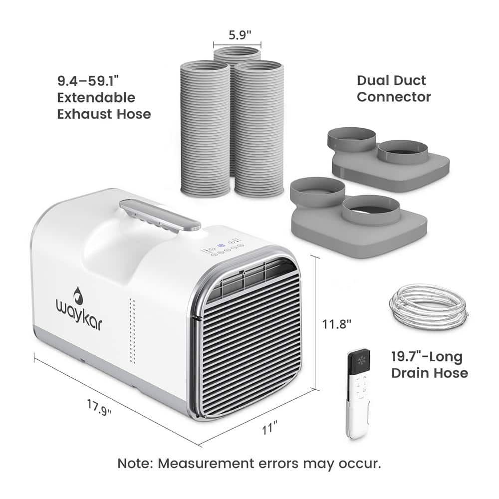 The waykar 4500 BTU Portable Air Conditioner is perfect for small spaces like tents, camping sites, and RVs, covering up to 130 sq. ft. It operates quietly, making it ideal for use in environments where noise levels matter. The unit comes with a remote control for easy operation. This compact 3-in-1 air conditioner not only cools efficiently but also dehumidifies and functions as a fan. It requires an AC power outlet to operate.