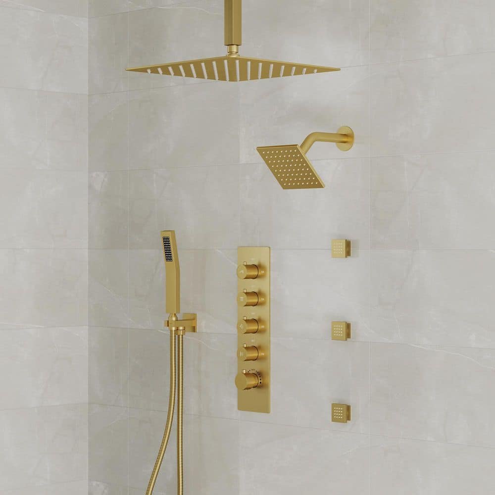 The 4-Function Luxury Brushed gold 12 in. Dual Shower Head Set combines high-quality materials, versatile functions and a stylish matte black finish. With 2 stainless steel handheld shower heads, a sturdy copper main body and a shower head bracket, this set is designed for durability and ease of use. The shower heads offer various spray patterns, including rainfall, massage, combination and hand-held sprays, allowing you to customize your shower experience. The stainless steel bar ensures secure mounting and adjustment, while the easy installation process makes it convenient for any user. Elevate your bathroom’s style and enjoy a luxurious showering experience with this durable and functional shower head set.