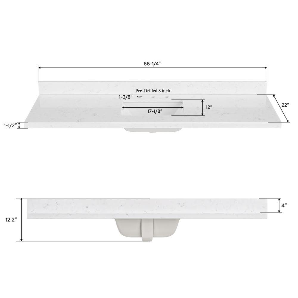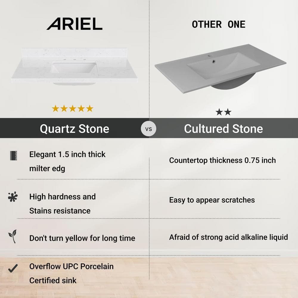 The warmly elegant and stylish ARIEL Carrara White vanity top complements most bathroom designs. This vanity top with sink is perfect for quick and easy remodels Obtain the beauty and durability of Carrara White Quartz without hiring a professional. Compatible with undermount sink looks beautiful with both light and dark cabinetry.