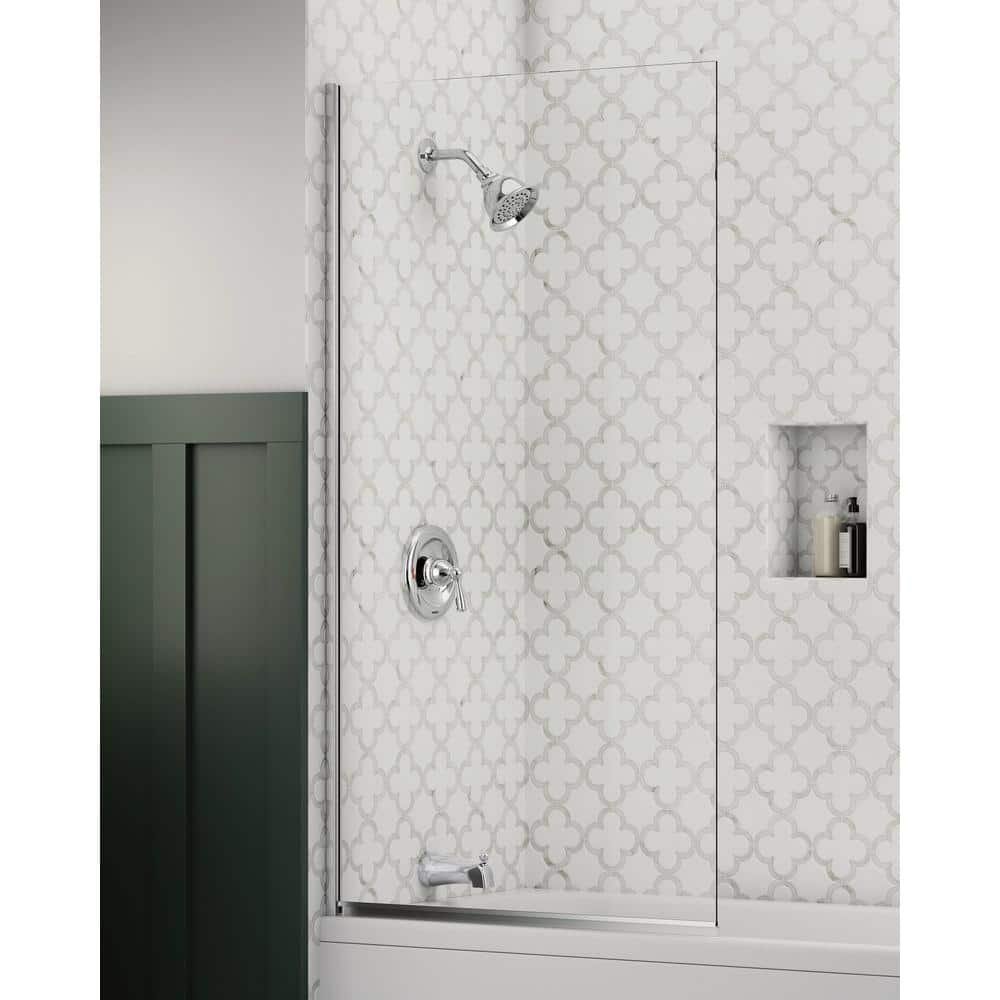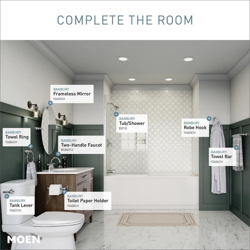 This MOEN Banbury 1-Handle Tub and Shower Faucet is transitionally designed and features a simple elegance that can easily accent your existing bathroom features. The single, lever-style handle is easy to use, while a pressure-balance valve helps prevent sudden bursts of hot or cold when water is running in other rooms. Self-cleaning nozzles and a durable chrome finish help you keep this fixture looking fresh and clean day after day.