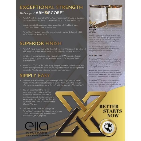 The Ella 1-Piece low threshold walk in showers stalls are commonly used for new construction as this unit does not disassemble. All entryways leading to and into the bathroom should be measured to make sure the shower fits before placing an order. Ella offers a 3 piece shower with a molded seat as an option for remodeling, model AX6033-3P. Ella walk in showers offers a seamless design with a 4 in. high threshold to provide easy access. Superior Finish – Acrylic applied acrylic offers a high gloss, truer white finish resulting in fewer scratches, cracks and chips for a longer lasting finish that looks factory new look years after installation. Structural Durability- whether in a warehouse or a new house, an Acrylic product is durable and will resist scratching, cracking and chipping to maintain a factory-new finish over its lifetime. Easy to Maintain – The finish material is less porous which creates an easier to clean surface that is less susceptible to chemicals, enhancing value and reducing everyday issues. Features a stylish simulated tile pattern for the walls and an anti-slip texture for the shower base floor. Due to the shower wall reinforcement, the wall is durable enough to withstand the installation of additional accessories, such as grab bars, seats and shower doors. Available in 3 sizes, 60 in. x 33 in., 48 in. x 37 in., 42 in. x 42 in. and 1 package called Liberty with 3 loose Stainless Steel Grab Bars. The shower is manufactured with a Lifetime Limited Warranty.