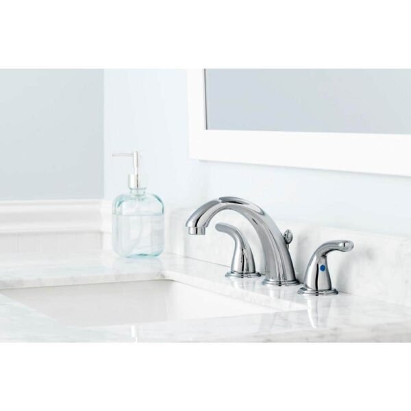 The Builders Widespread 2-Handle High-Arc Bathroom Faucet from Glacier Bay in Chrome finish offers an attractive curved design with smooth, soft lines. WaterSense certified, this efficient faucet features a 1.2 GPM flow rate to help reduce water use and ceramic disc cartridges to prevent drips. Easy to use with dual lever handles and a high-arc spout, it is finished in gleaming chrome. This Faucet features the Glacier Bay exclusive ClickInstall drain for quick and simple installation. Pair with other pieces from the Builders collection to create a stylish theme throughout your bathroom.