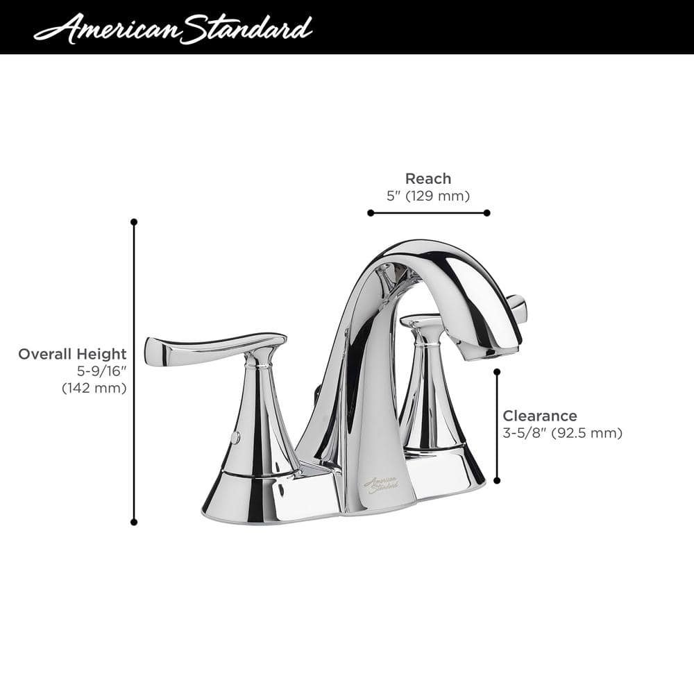 The free-flowing lines of the Chatfield Mid-Arc 2-Handle Centerset Bathroom Faucet from American Standard channel the simple beauty of nature. With a mirror-like Chrome finish, the 2 lever handles allow you to easily control water flow and temperature. Ceramic disc valve cartridges, standard on all American Standard faucets, ensure a lifetime of drip-free performance. ADA-compliant and WaterSense approved, this faucet is both inspired by nature and helping to sustain it. Available in a variety of finishes, the Chatfield collection offers a look to fit almost any bathroom decor.