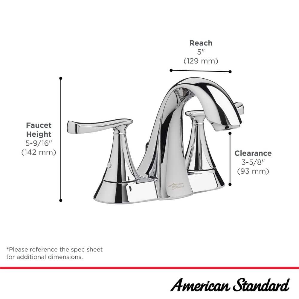 The free-flowing lines of the Chatfield Mid-Arc 2-Handle Centerset Bathroom Faucet from American Standard channel the simple beauty of nature. With a mirror-like Chrome finish, the 2 lever handles allow you to easily control water flow and temperature. Ceramic disc valve cartridges, standard on all American Standard faucets, ensure a lifetime of drip-free performance. ADA-compliant and WaterSense approved, this faucet is both inspired by nature and helping to sustain it. Available in a variety of finishes, the Chatfield collection offers a look to fit almost any bathroom decor.