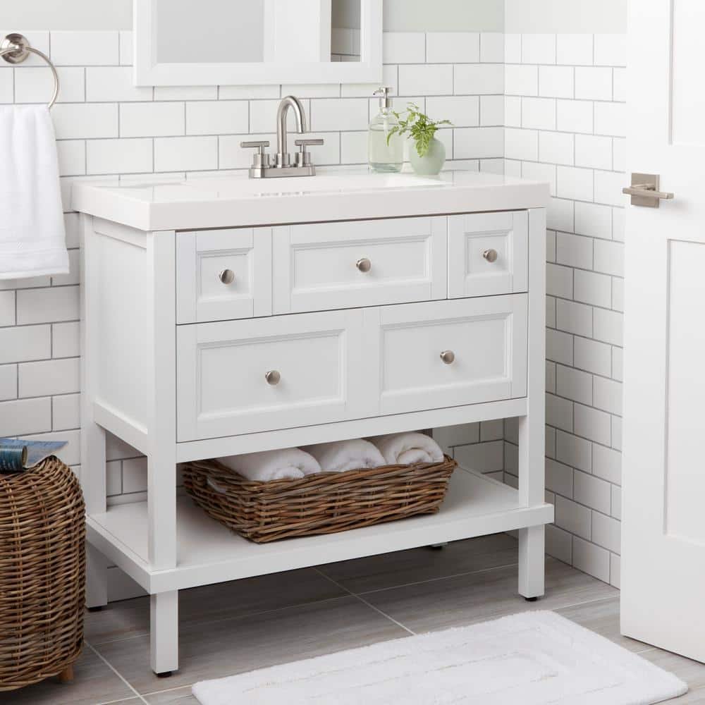 Enhance your bathroom interior with the Glacier Bay Dorset 4-in. Center set Bathroom Faucet. The double-handle design and a high-arc spout produce easy operation and plenty of sink space. The ceramic disc cartridges ensure drip-free use. For a convenient installation, this faucet offers ClickInstall drain assembly. The brushed nickel finish makes it built to last.