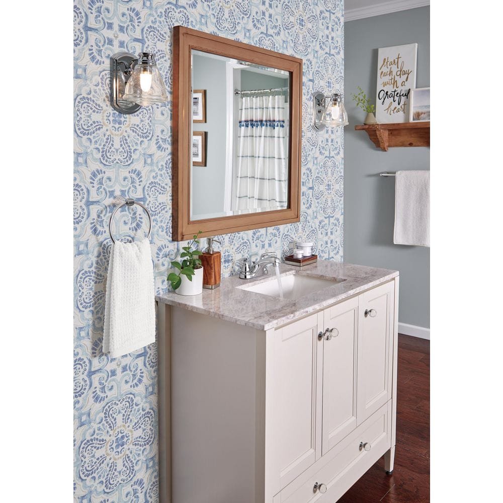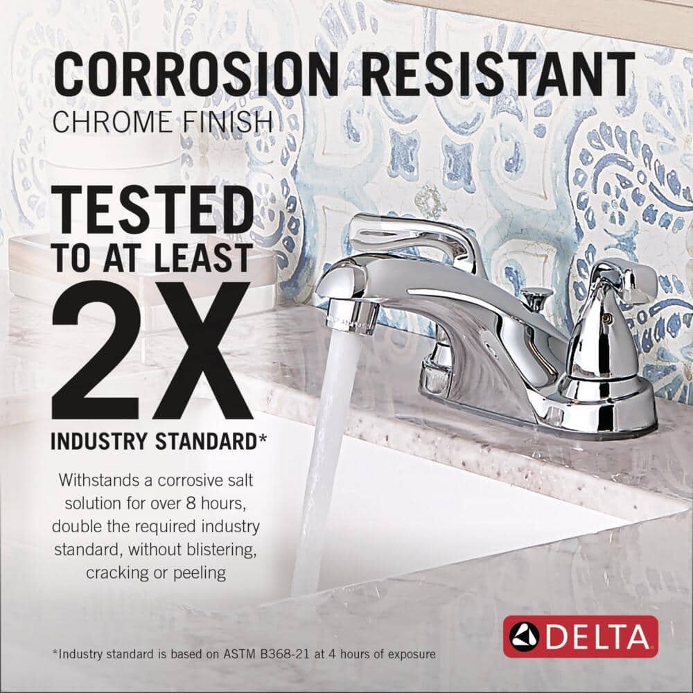 For an updated look or for new installation, consider the Foundations 4 in. 2-Handle Low Arc Bathroom Faucet in Chrome. The faucet features a deck-plate mounting design and is installed in 3 holes with 4 in. on-center spacing. The 2 handle lever design makes the faucet easy to operate while the low-arc spout leaves plenty of room for washing hands. This environmentally-friendly faucet is WaterSense-certified to reduce water waste.