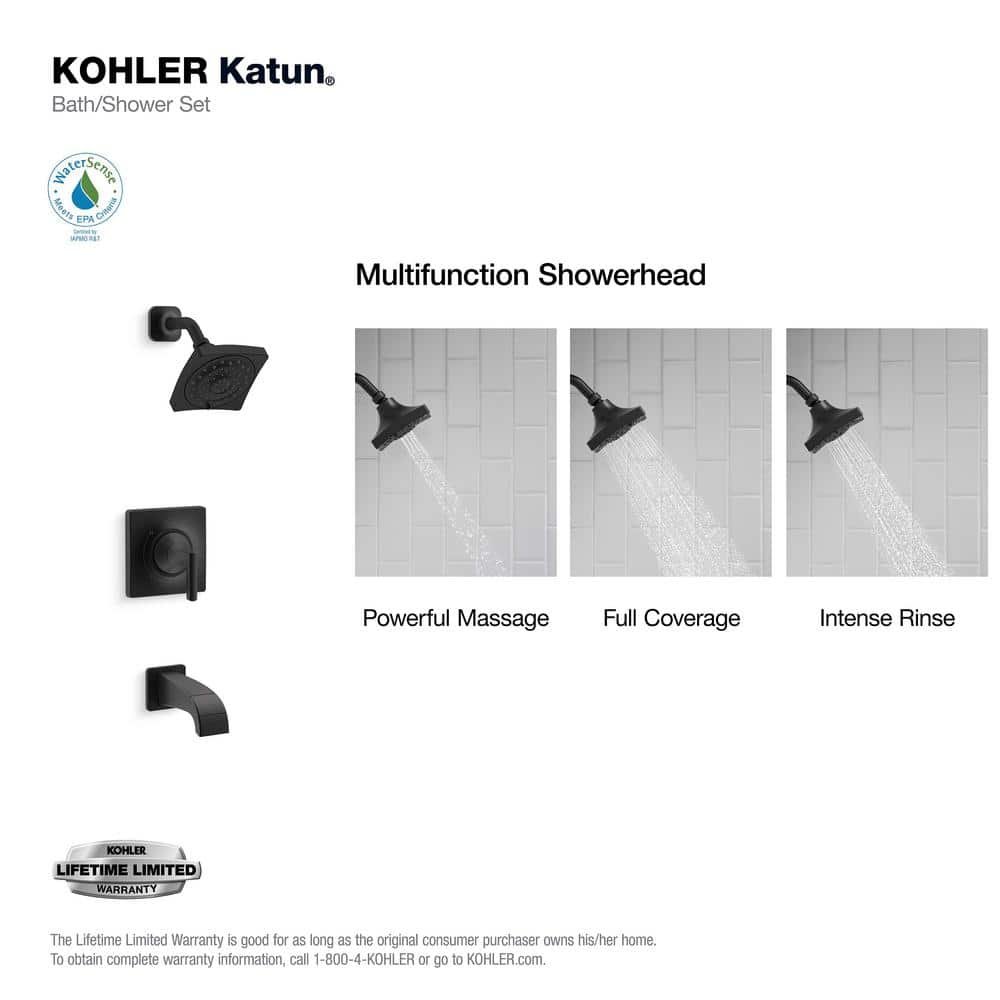 With striking lines and carefully crafted geometry, Katun adds an element of surprise to your bathroom. This complete Katun shower and bath trim set includes a 1.8 GPM (gallons per minute) showerhead with three distinct spray experiences: an all-encompassing wide spray, a drenching spray for rinsing, and an invigorating massage spray to ease aches and pains. It comes with a lifetime limited warranty.