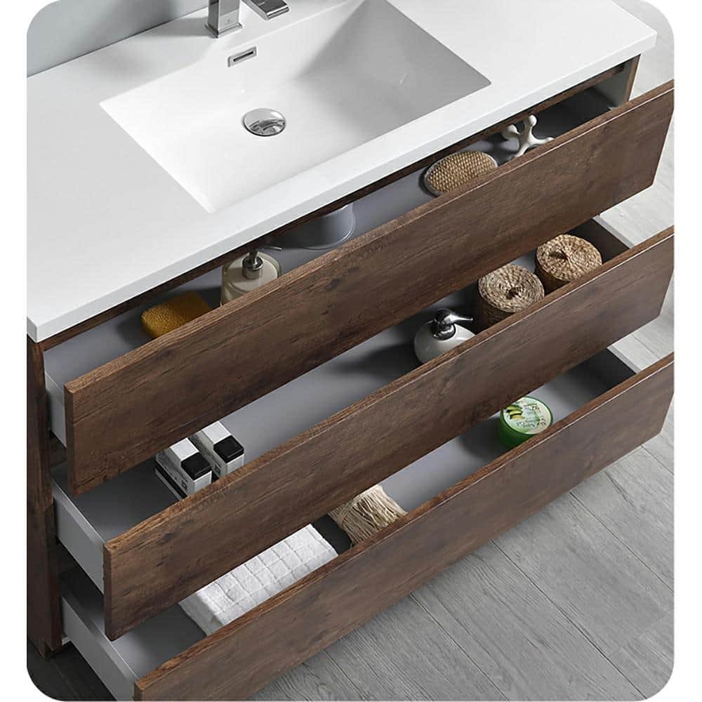 With its stylish Rosewood finish, the Fresca Lazzaro Freestanding Modern Bathroom Cabinet is the ideal combination of style and function. Spacious soft-closing wood drawers can hold all of your bathroom essentials, while a roomy under-the-sink compartment provides additional space for tucking away towels or storage baskets. The drawers and doors feature push-release hardware, offering a streamlined front that beautifully complements the minimalist design. This modern cabinet will enhance any decor and is available in multiple sizes and finishes. It includes installation hardware.