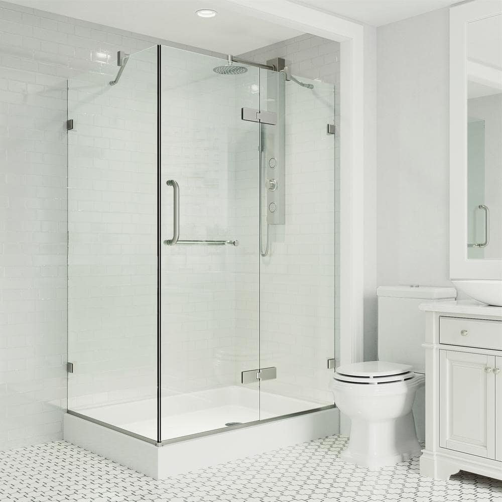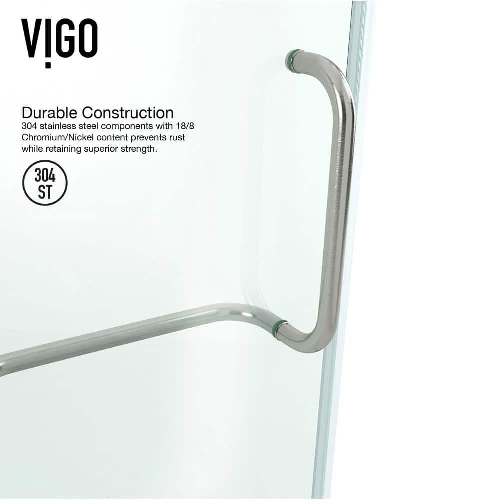 The VIGO Monteray shower enclosure, measuring 48-in W X 36-in D X 79-in H, combines functionality with modern design elements. This frameless enclosure features 3/8-inch tempered glass panels with a door that opens outward to a comfortable 24-inch width. Dual hinges enable smooth 90-degree movement for effortless entry and exit. The smart-adjust technology accommodates up to 3/8-inch of wall settling, ensuring consistent door alignment. The frameless design creates open sightlines and maximizes natural light flow, while chrome or brushed nickel finishes complement contemporary bathroom decor. A dual-sided handle serves as both door pull and towel rack for added convenience. Water stays contained thanks to a full-length magnetic door catch, continuous seal strips, and metal threshold. The fixed support arm maintains structural integrity during daily use. The glass enclosure integrates a minimalist aesthetic that works well with various bathroom styles. The design emphasizes clean lines and spatial efficiency, while maintaining durability and practical functionality. Simple maintenance requires only a quick wipe after each use to preserve the glass appearance and prevent buildup of mineral deposits.