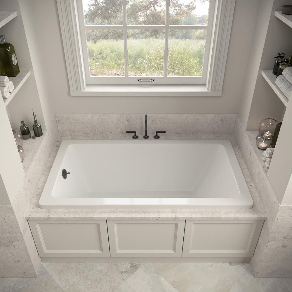 Introducing the exquisite Streamline N-4060-703-BL 60 in. x 32 in. Acrylic Soaking Drop-In Bathtub in Glossy White, With External Drain in Matte Black-a perfect harmony of luxury and practicality. Crafted from 100% pure acrylic, this bathtub showcases a timeless glossy white finish that resists scratches and stains, ensuring enduring beauty. With dimensions measuring 60 in. by 32 in. and a generous water capacity of 53 gal., it offers an expansive and immersive bathing experience. The bathtub comes with an external matte black drain for added convenience. The inclusion of adjustable leveling feet allows for customizable height adjustment, ensuring optimal comfort tailored to your preference. Elevate your relaxation with the peerless charm of the Streamline N-4060-703-BL 60 in. x 32 in. Acrylic Soaking Drop-In Bathtub in Glossy White, With External Drain in Matte Black, where comfort and craftsmanship unite seamlessly.