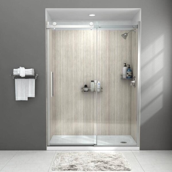 The Passage Frameless Shower Doors feature a sleek style with 3/8” thick, tempered glass that stays cleaner longer. The stylish, sliding barn-door style operation completes the premium shower look when paired with the Passage Shower Walls. The Easy-to-Clean glass sheets water to help prevent streaking. Designed to operate smoothly and look beautiful, these shower doors will stand out in any bathroom renovation. Features Frameless shower with barn door-type sliding operation Coordinates with Passage 60 in. Custom Shower Walls and Passage 60 in. shower base Clear, 3/8 in. thick tempered glass for safety Easy-to-clean glass helps prevent streaking by sheeting the water to carry away dirt Reversible door opening installs with sliding door on left or right Aluminum components and stainless steel screws prevent rusting or corrosion 24 in. door opening width Out-of-plumb adjustability 15 in. chrome handle for ease of use.