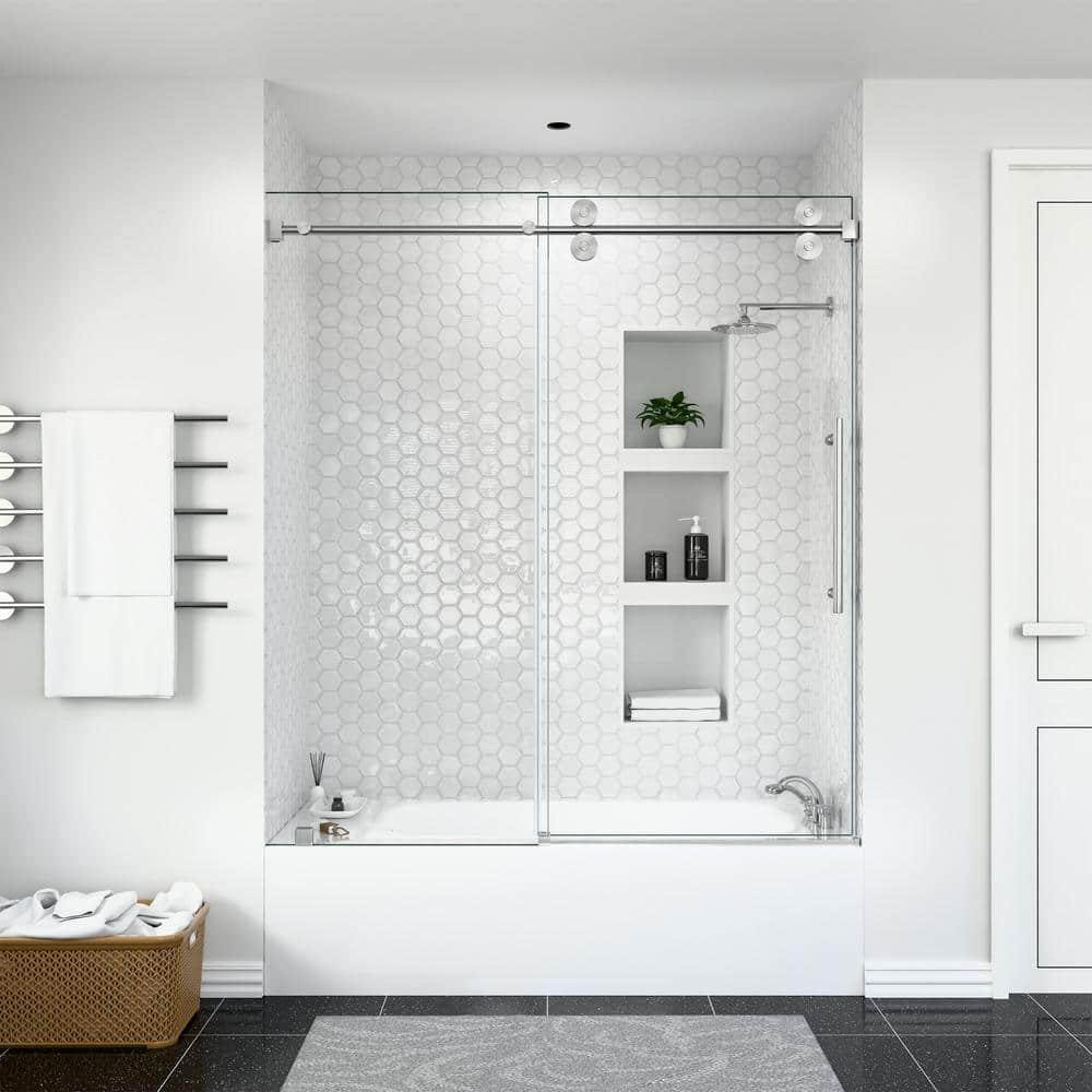 Serena 60 in. W x 66 in. H Sliding Frameless Tub Door in Brushed Nickel with 3/8 in. (10 mm) Tempered Clear Glass
