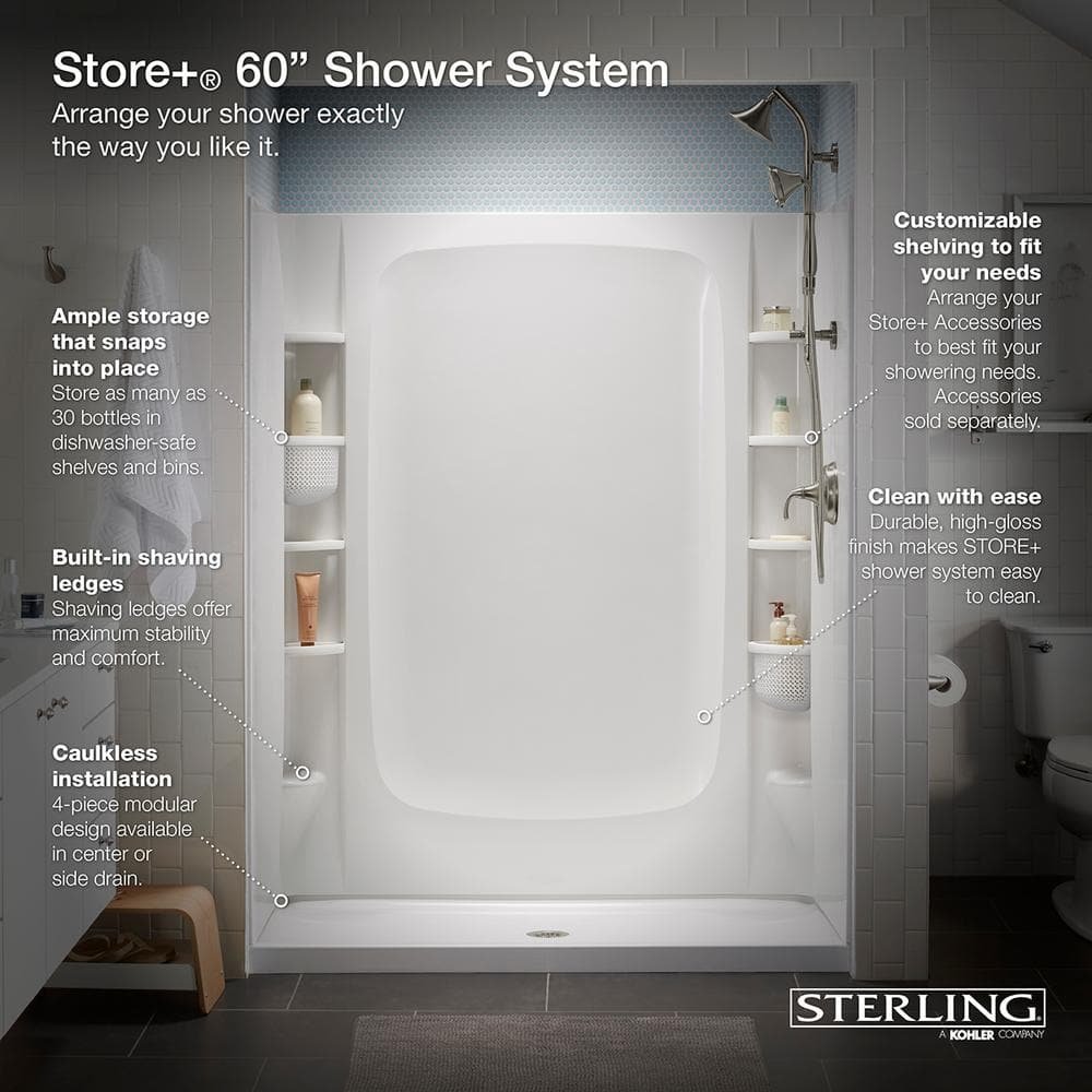 Arrange your shower exactly the way you like it with STORE+. A fully customizable storage system, it features movable accessories that make keeping everything right in its place easy. The STORE+ shower stall is built of solid Vikrell for material strength, durability and lasting beauty. Pair these end walls with a GUARD+ base and STORE+ back wall.