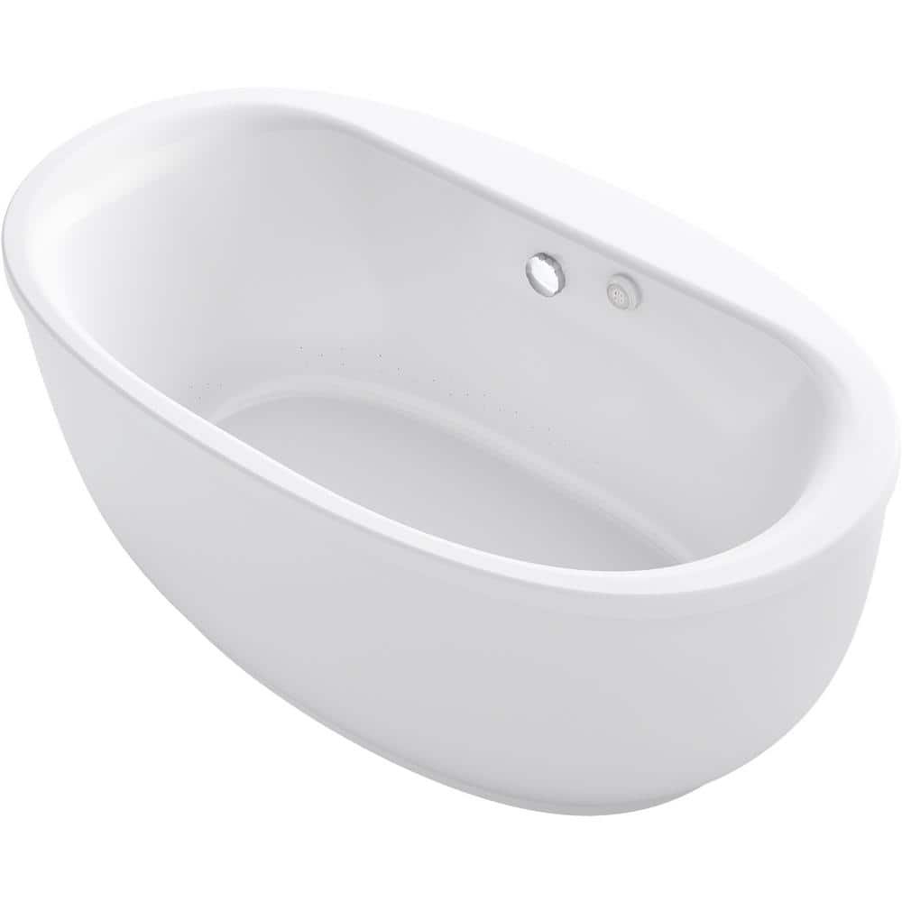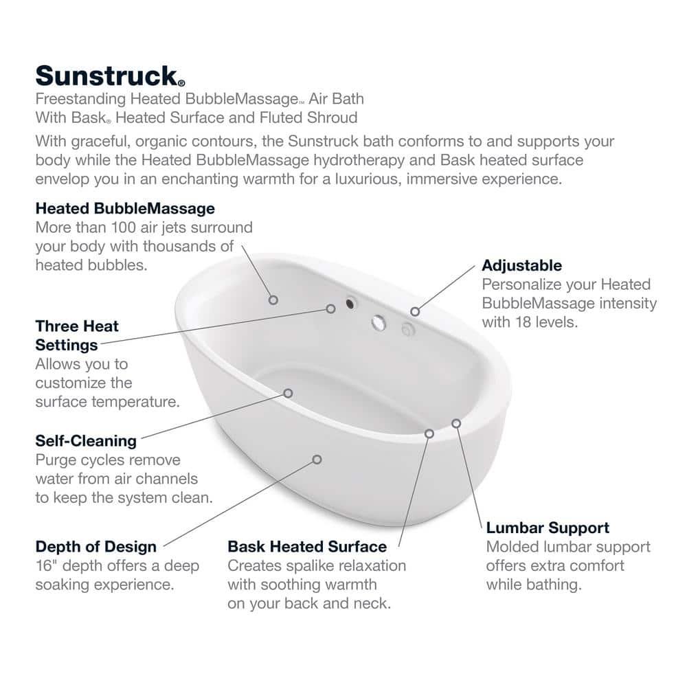 Completely surround your body in a soothing cushion of heated massaging bubbles in this Sunstruck freestanding air bath. With air jets pushing humidified air through the water, this bath delivers a blissfully warm, invigorating full-body massage experience, while the heated surface warms your back, shoulders and neck. The oval, ergonomic design supports your body for a deep, relaxing soak. With its gracefully shaped lines and fluted shroud, this versatile bath complements a wide range of bathroom styles and offers easy 3-step installation.